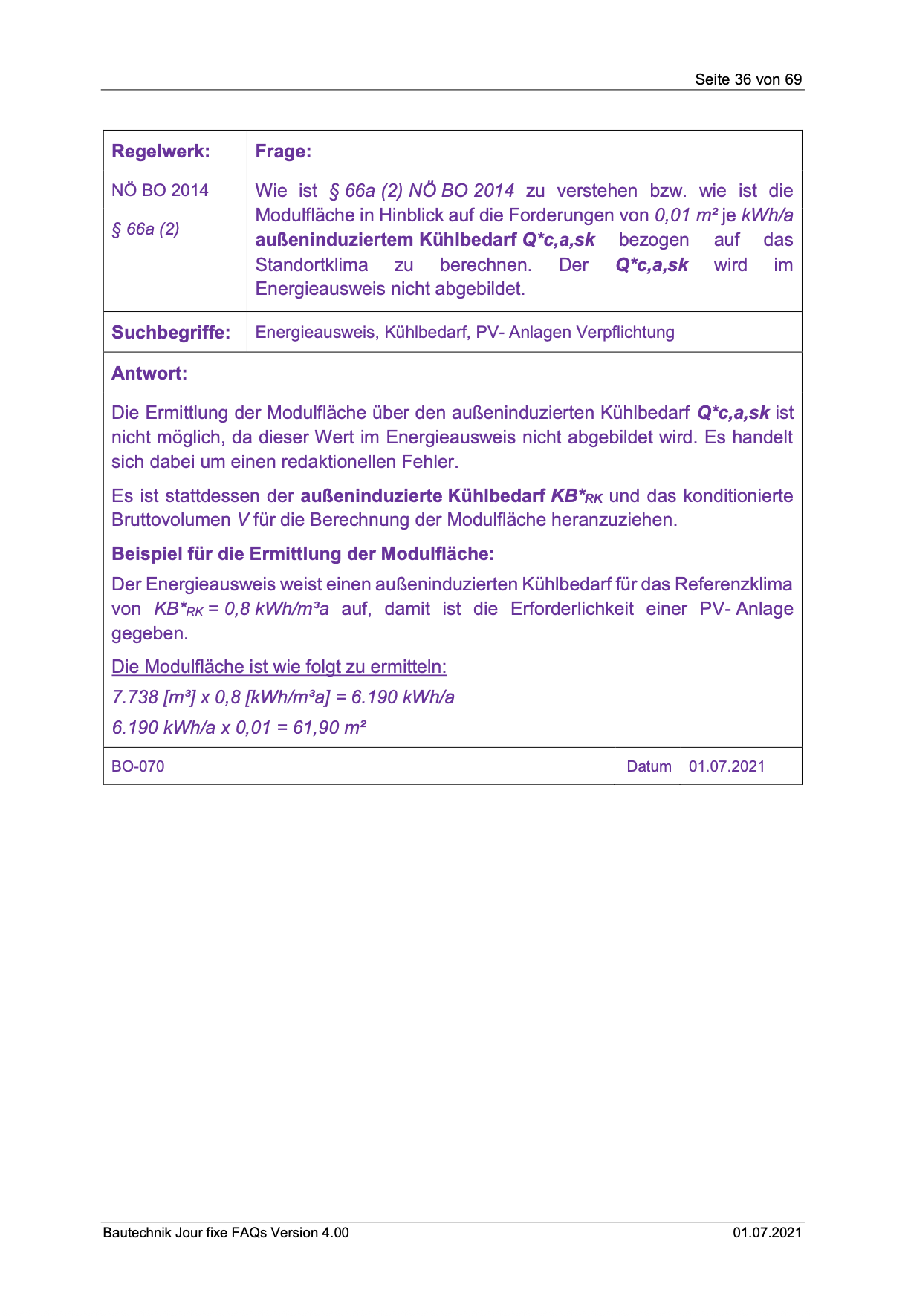 Die NÖ Bauordnung 2014 § 66a (2) verlangt für bestimmte Gebäude eine Photovoltaikanlage, deren Modulfläche sich nach dem außeninduzierten Kühlbedarf bemisst. Im Energieausweis wird der Wert Q*c,a,sk jedoch nicht abgebildet. Dabei handelt es sich um einen redaktionellen Fehler in der Verordnung.