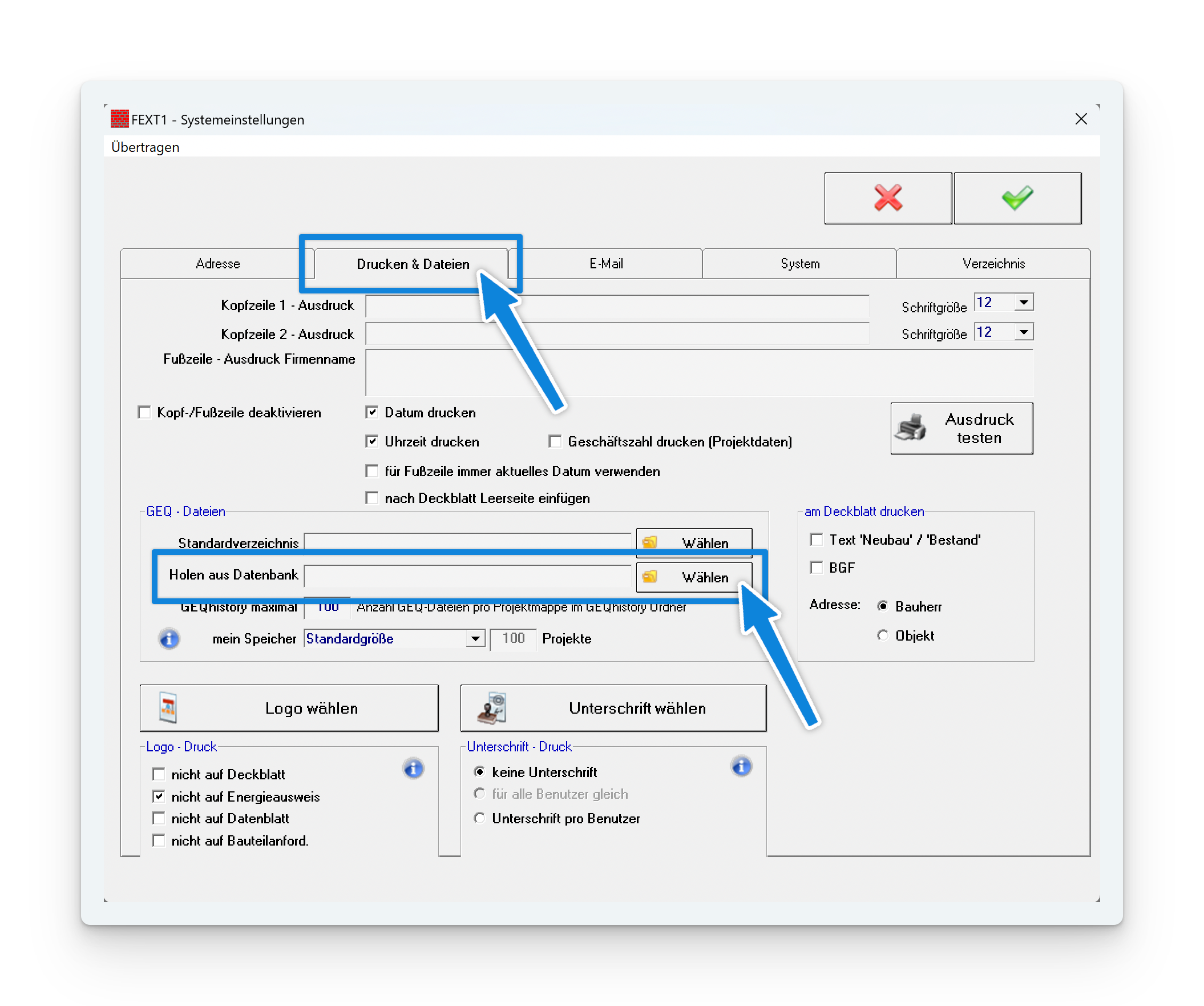 Sobald Sie hier das Verzeichnis zur alten Datenbank festgelegt haben, erscheint am Start Bildschirm von GEQ der Button "Holen aus Datenbank".