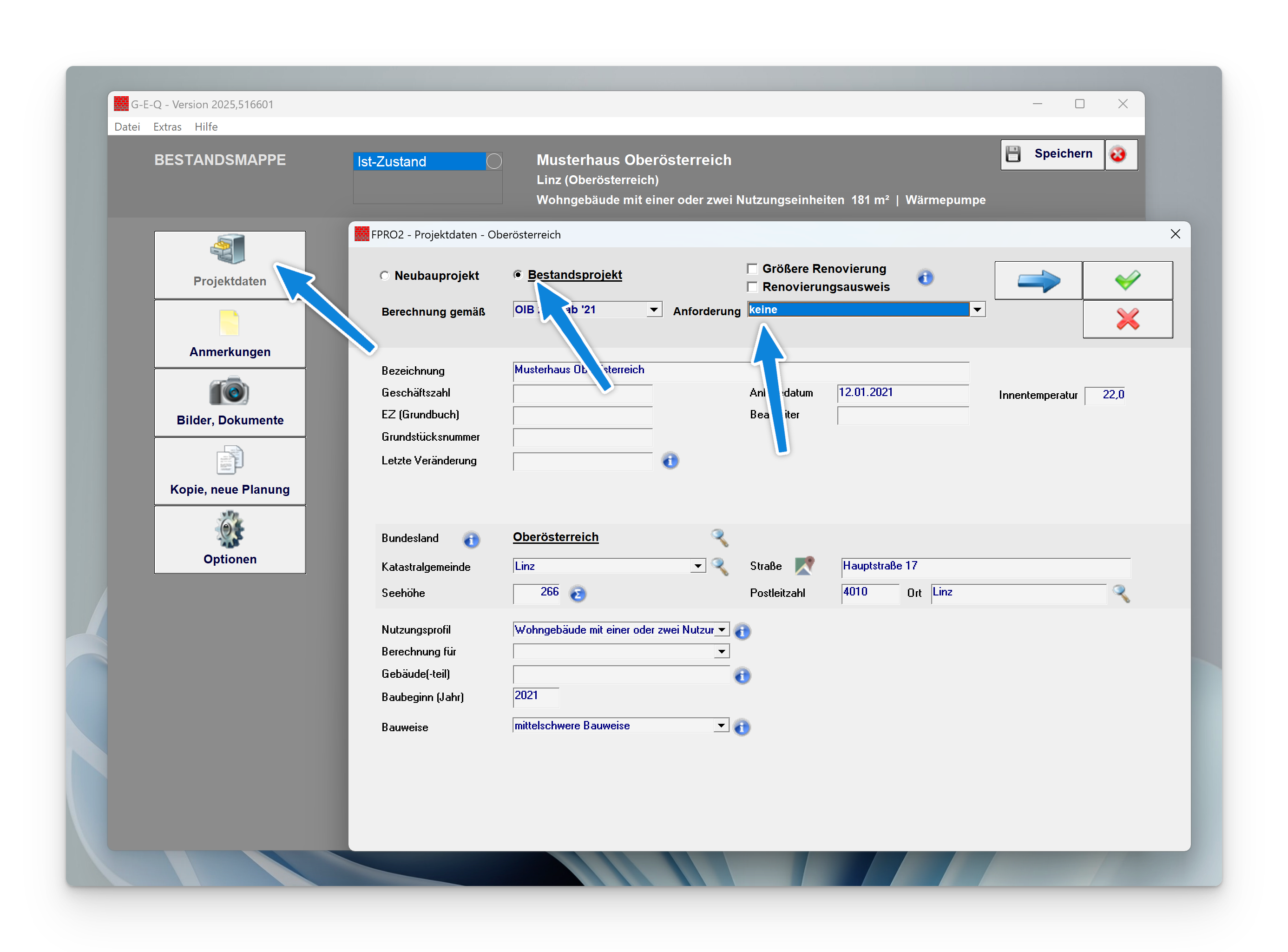 Ein Energieausweis ist laut dem Energieausweis-Vorlagegesetz 10 Jahre gültig. Wenn Sie einen Energieausweis für ein bestehendes Gebäude neu ausstellen möchten und diesen sozusagen verlängern möchten, müssen Sie einfach nur in den Projektdaten auf "Bestandsprojekt" umstellen und Anforderungen auf "keine" stellen.