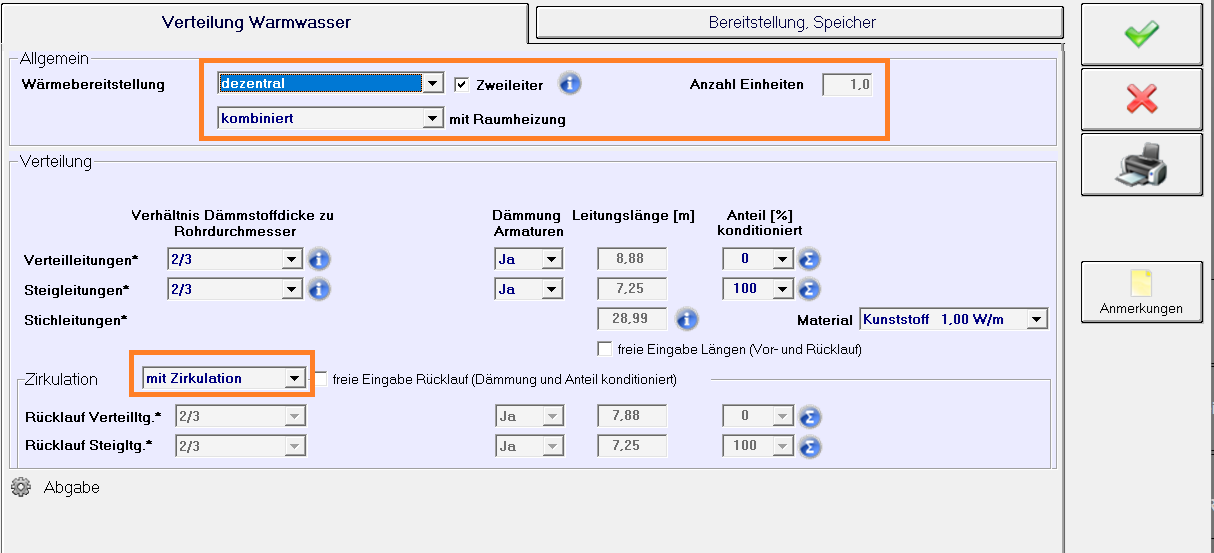 Das Häkchen Zweileiter aktivieren und die Zirkulationsleitung eingeben.