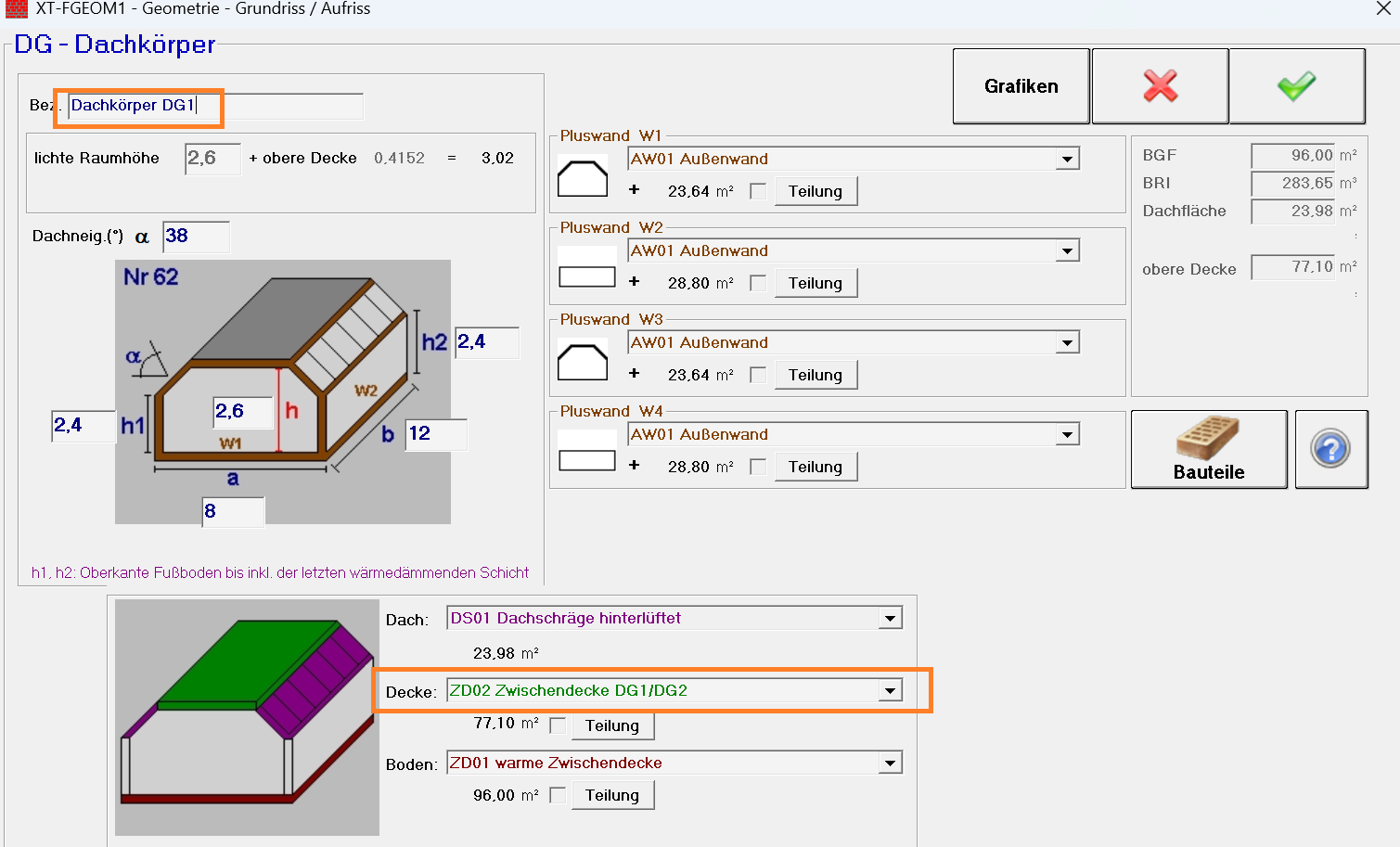 In den Bauteilen die Zwischendecke zwischen DG1 und DG2 anlegen.