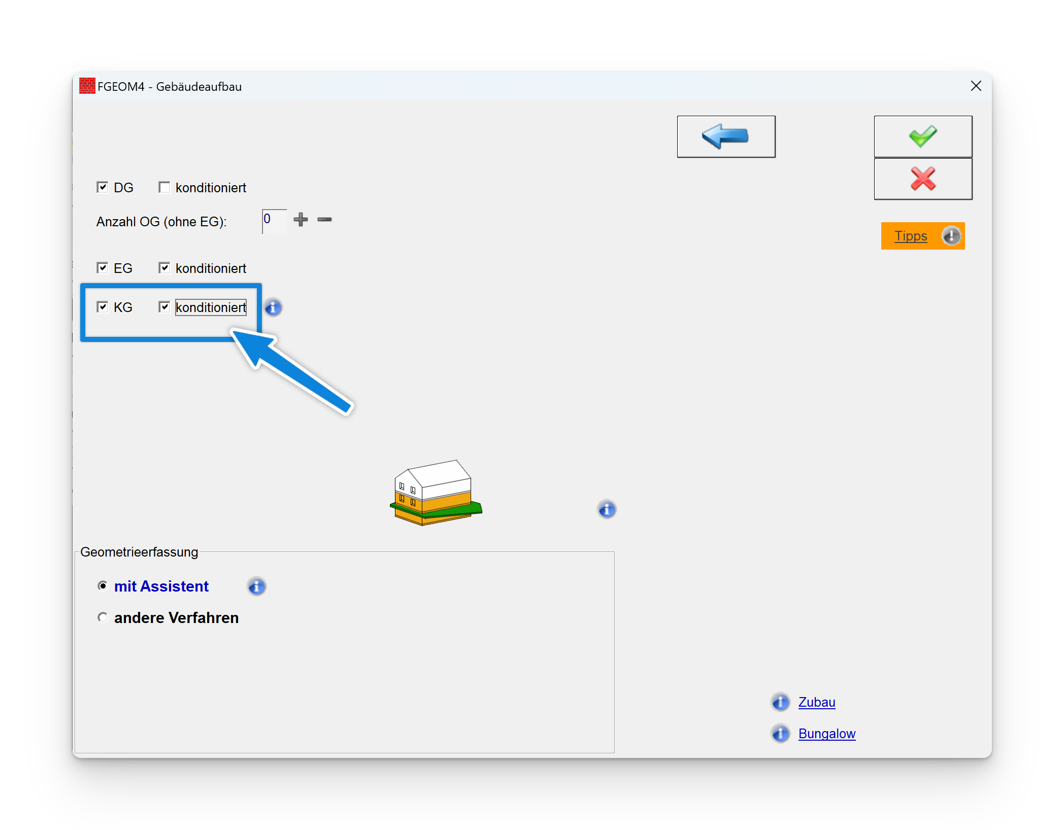 Für die Eingabe des teilbeheizten Kellers, muss das Häkchen „konditioniert“ im Kellergeschoss aktiviert sein.