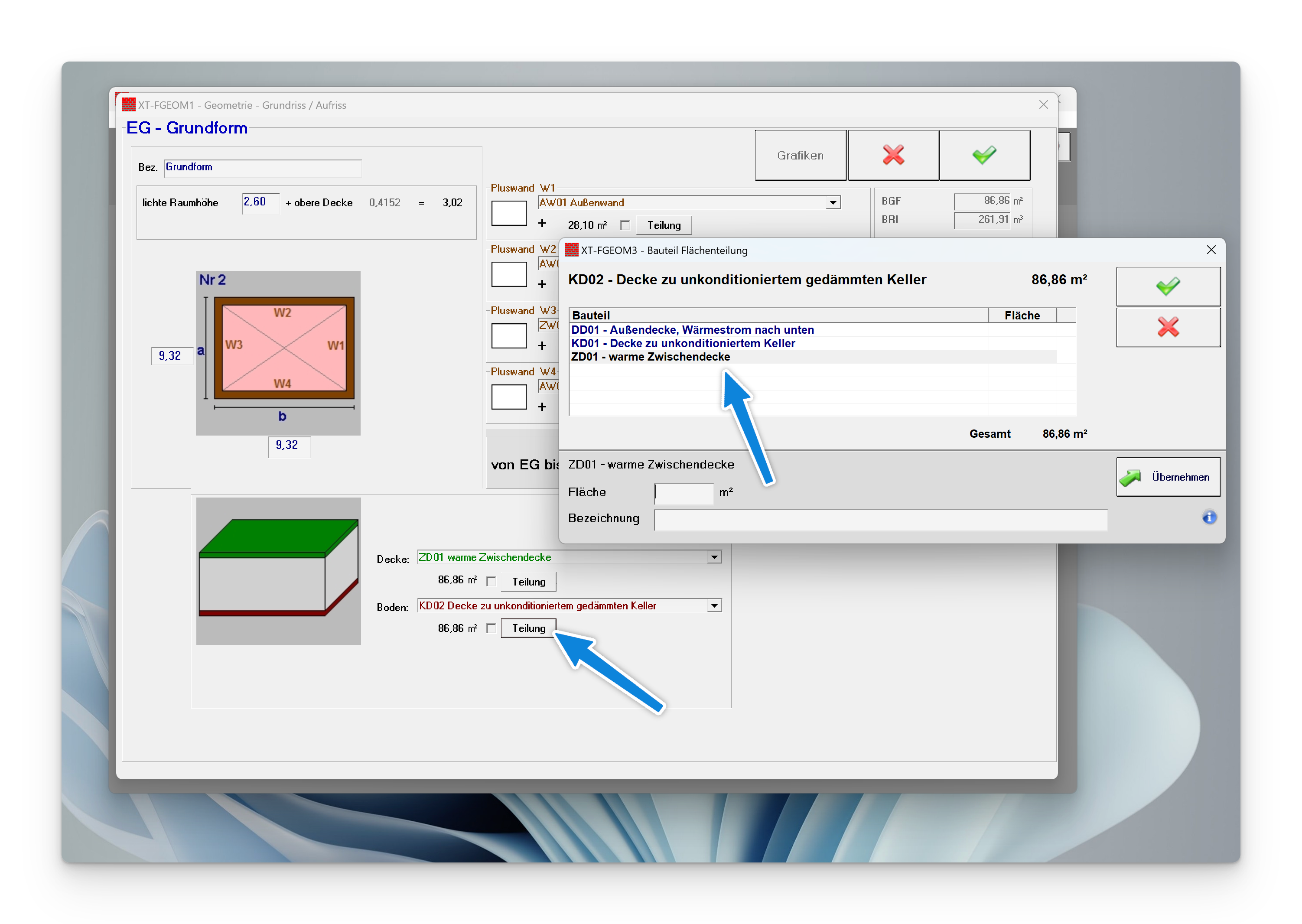 Die Decke zwischen Erdgeschoss und Keller muss in „ZD01 warme Zwischendecke“ und „KD02 Decke zu unkonditioniertem Keller“ geteilt werden.