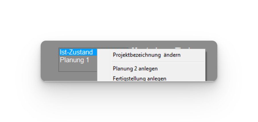 Mit einem Rechtsklick auf einen Projektmappenstatus (z.B. IST-Zustand oder Planung) kann schnell und einfach ein neuer Projektmappenstatus angelegt werden (z.B. Planung 2 oder Fertigstellung)