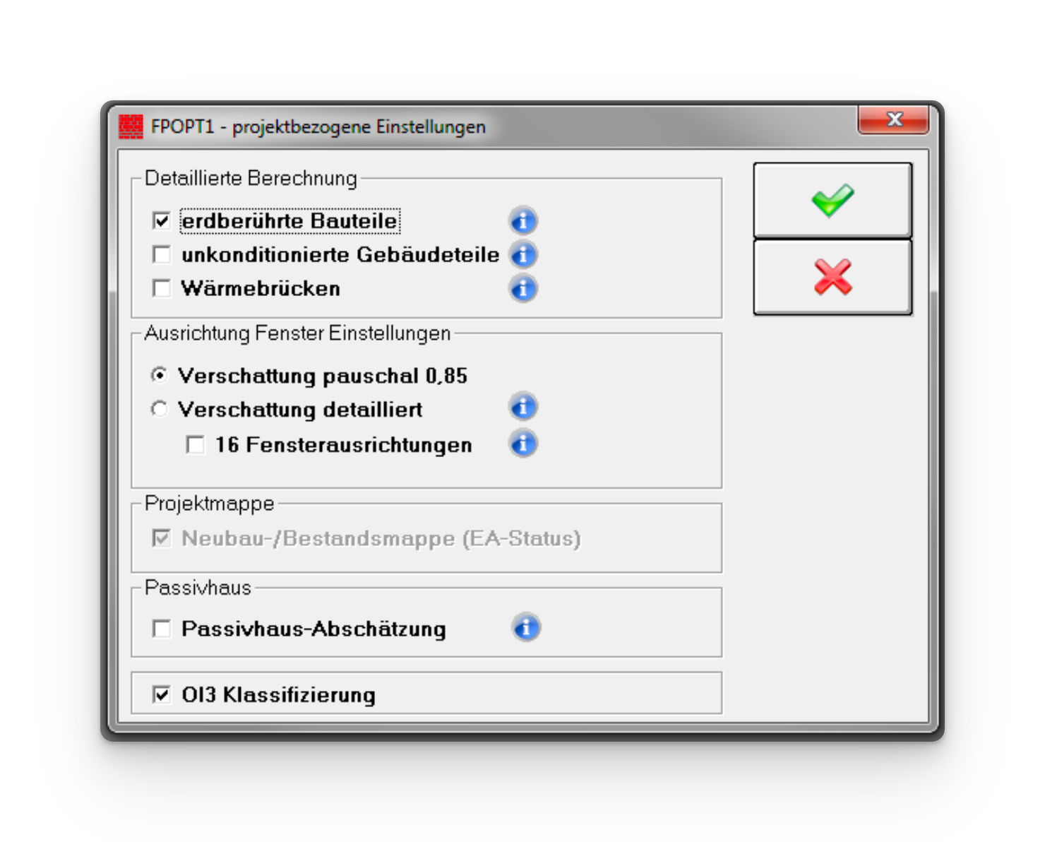 Berechnungsoptionen für das aktuelle Projekt. In den Optionen können verschiedene detaillierte Berechnungen aktiviert werden: