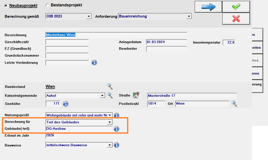 In den Projektdaten, Berechnung für "Teil des Gebäudes" auswählen: