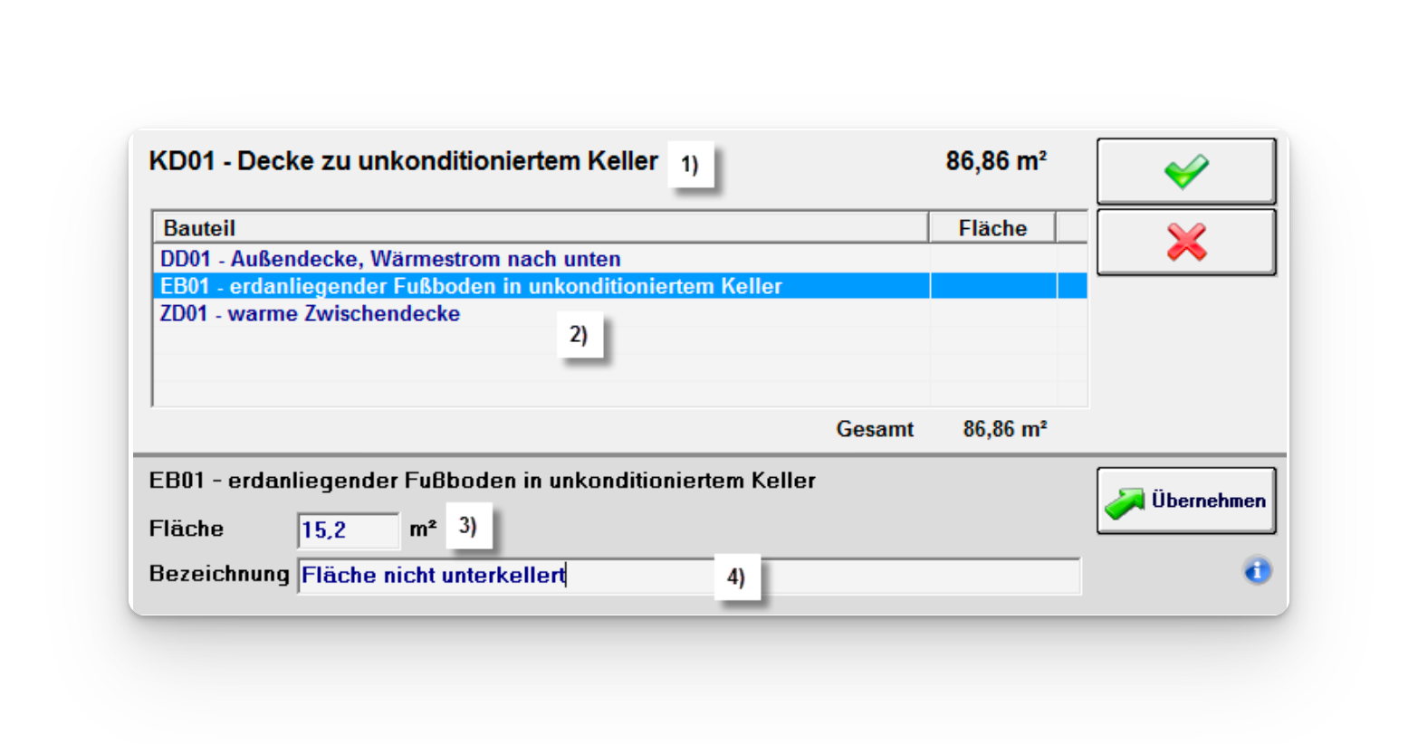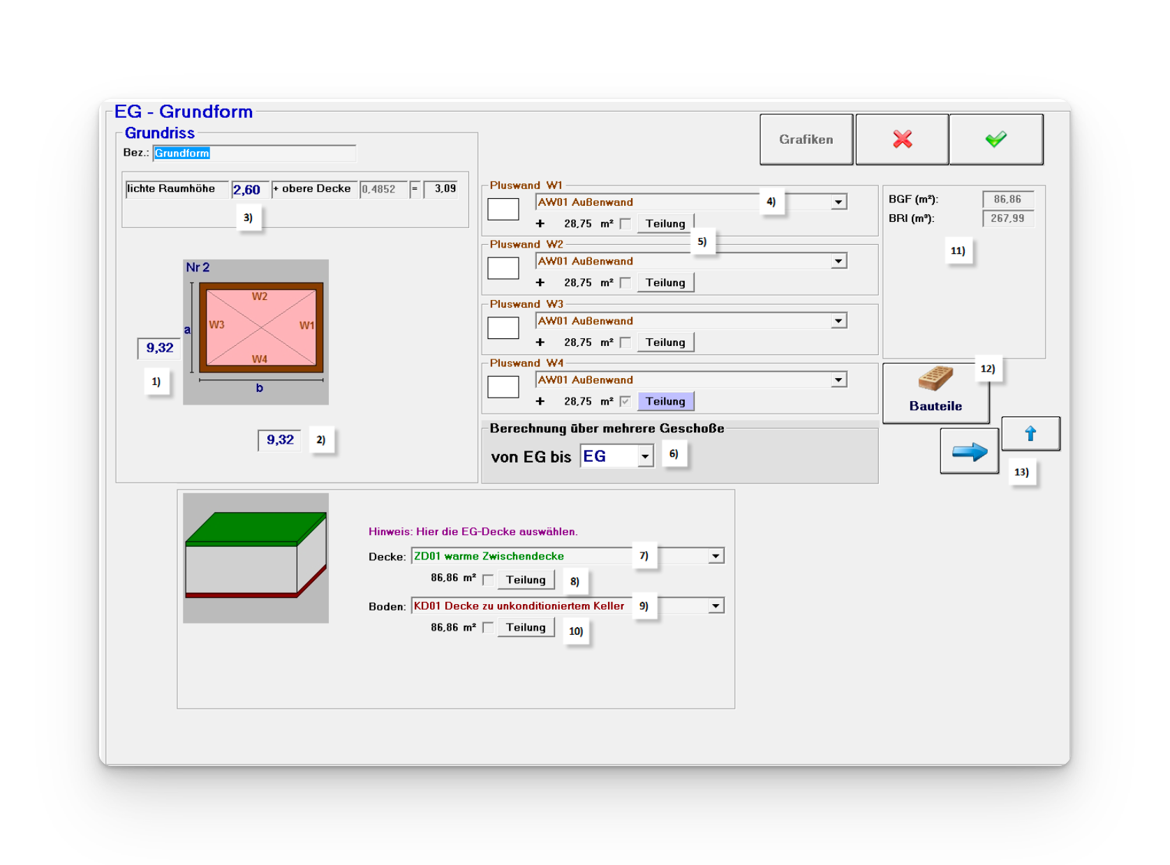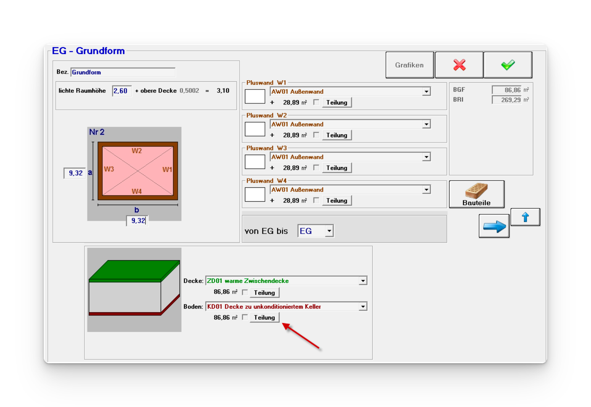 Im Beispiel wurde die Kellerdecke als Boden-Hauptbauteil ausgewählt, da die Kellerdecke den größeren Teil darstellt.