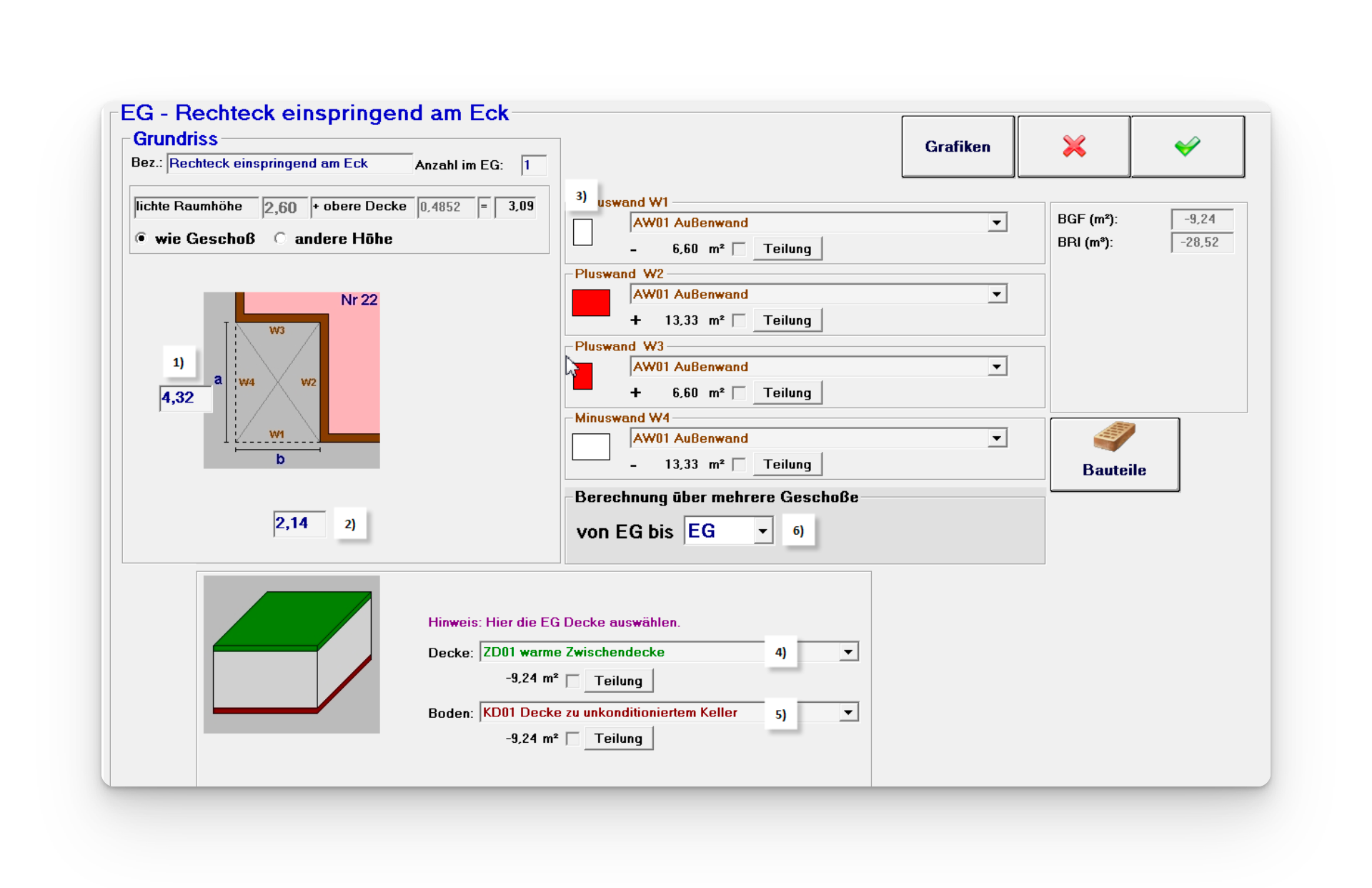 Hinweis: das Volumen der untersten Decke ist im Menüpunkt Geometrie nicht im Wert Bruttorauminhalt enthalten.