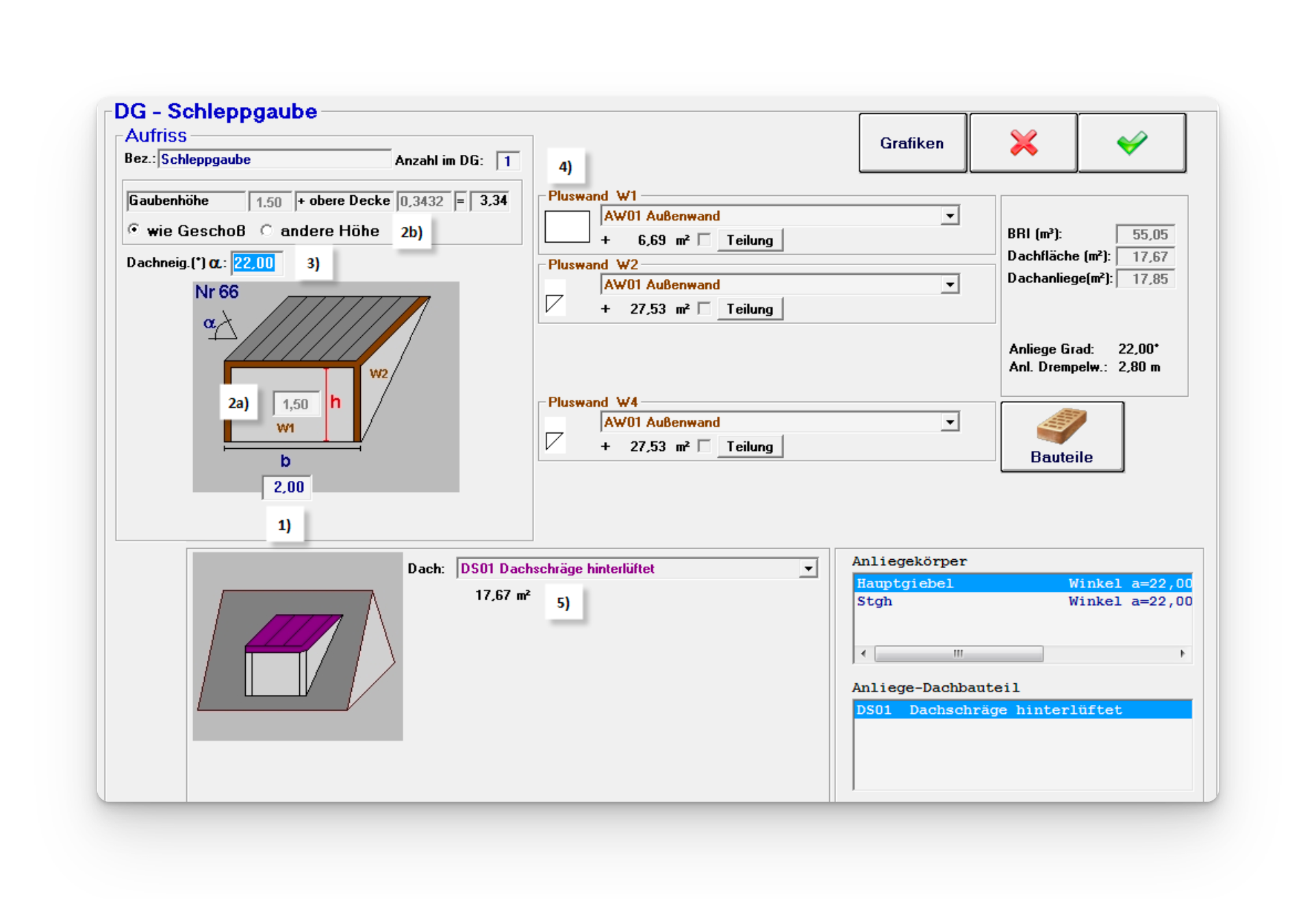 Wenn die Gaube einen anderen Wand-Bauteil aufweist als die Grundform, kann z.B. von „AW01“ auf „AW02“