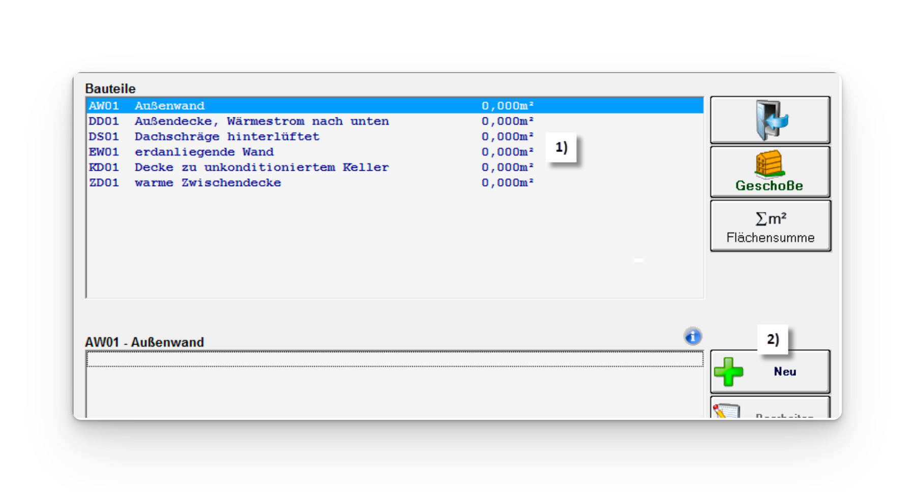 Im Beispiel wurde die AW01 als Wand-Hauptbauteil ausgewählt, da die AW01 den größeren Teil darstellt.