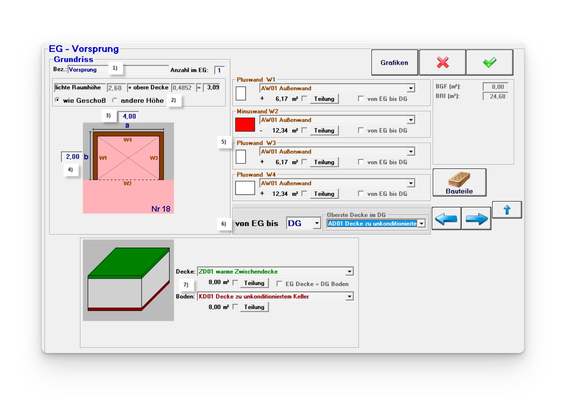 Wenn der Vorsprung einen anderen Wand-Bauteil aufweist als die Grundform, kann z.B. von „AW01“ auf „AW02“ umgeschaltet werden. Dabei ist zu beachten, dass die Minuswand weiterhin AW01 bleibt, damit diese korrekt von der Grundform abgezogen wird.