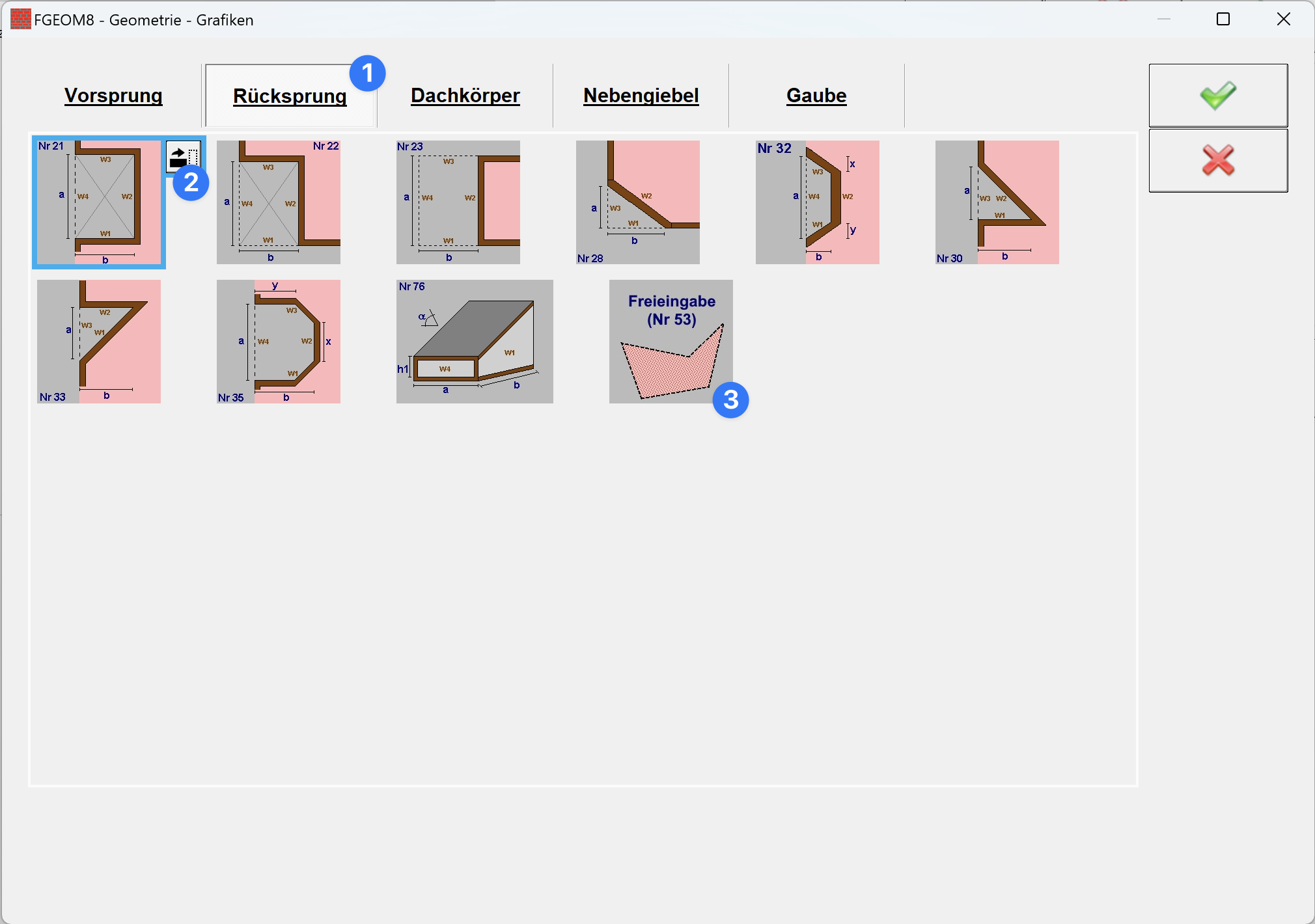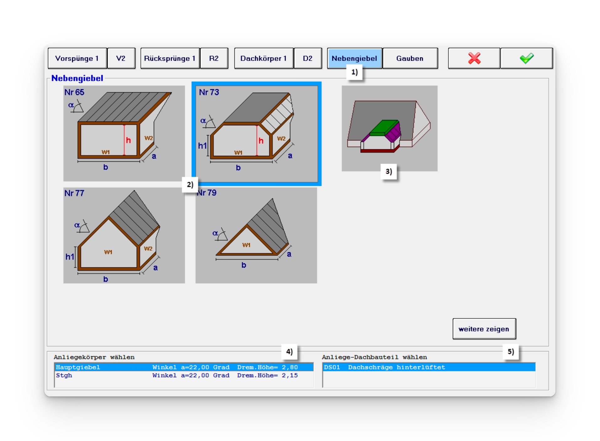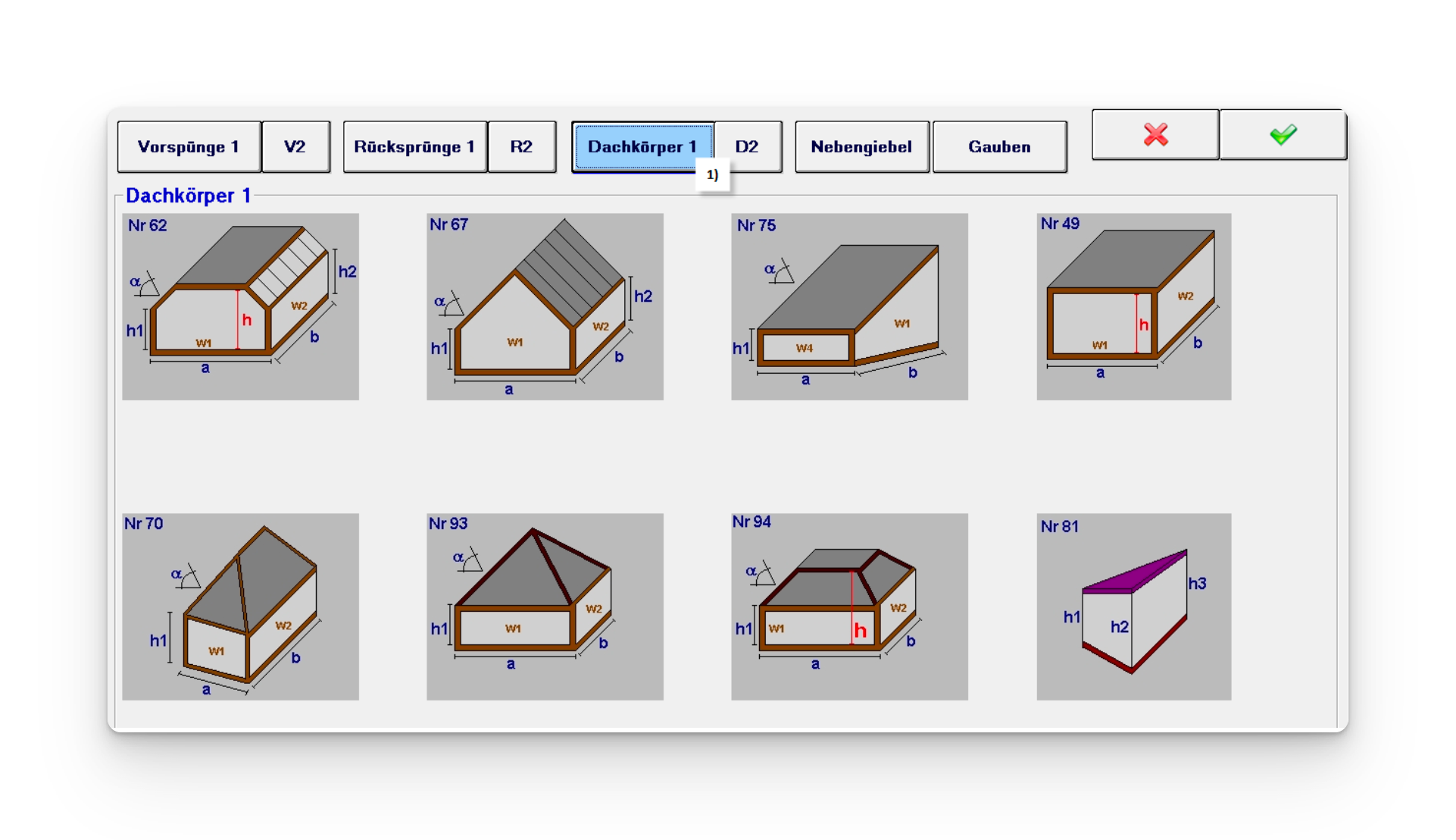 1) Es kann aus 12 verschiedenen Dachformen gewählt werden.