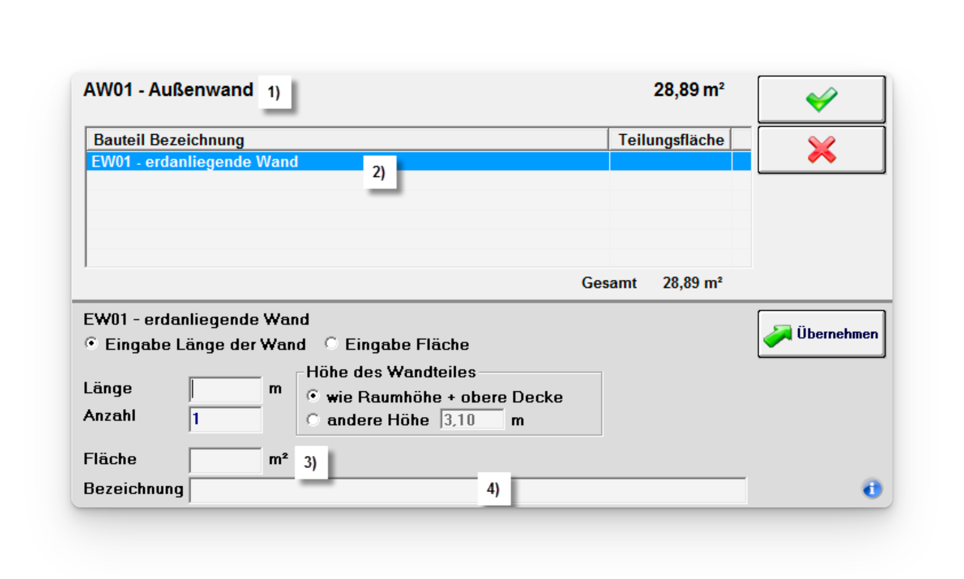 Es kann zwischen Eingabe der Länge der Wand und Eingabe der Fläche (z.B. bei Dreiecksform hilfreich) gewählt werden.