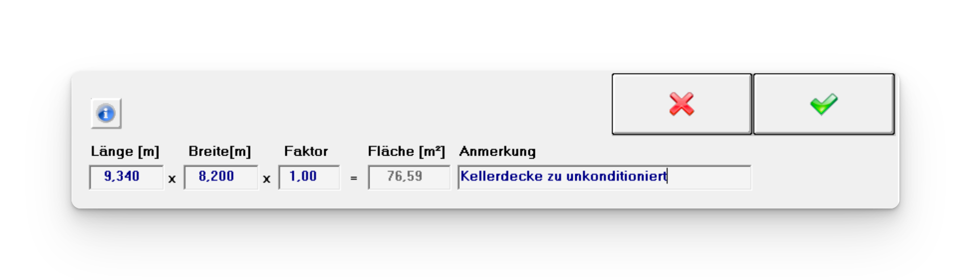 Die Länge und die Breite der Kellerdecke eingeben und bestätigen. Anschließend werden die Fläche der obersten Decke bzw. der Dachschräge eingegeben.