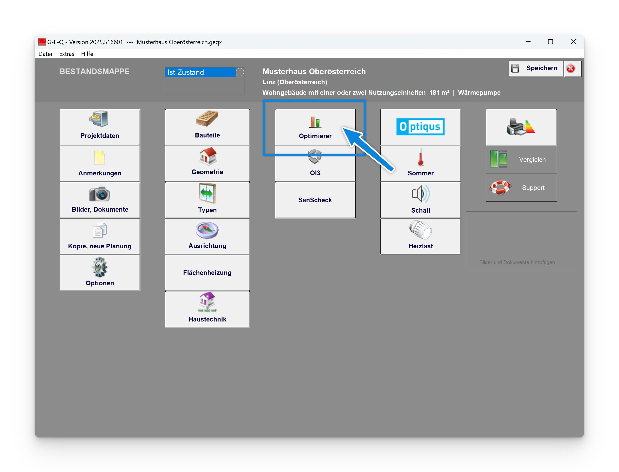 Der Menüpunkt "Optimierer" öffnet das Dashboard.
