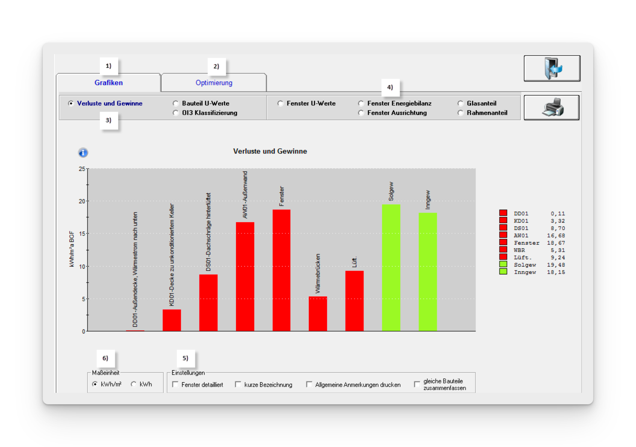 Die Diagramme können wahlweise mit absoluten Verlusten/Gewinnen in kWh pro Jahr oder in kWh pro m²BGF und Jahr dargestellt werden.