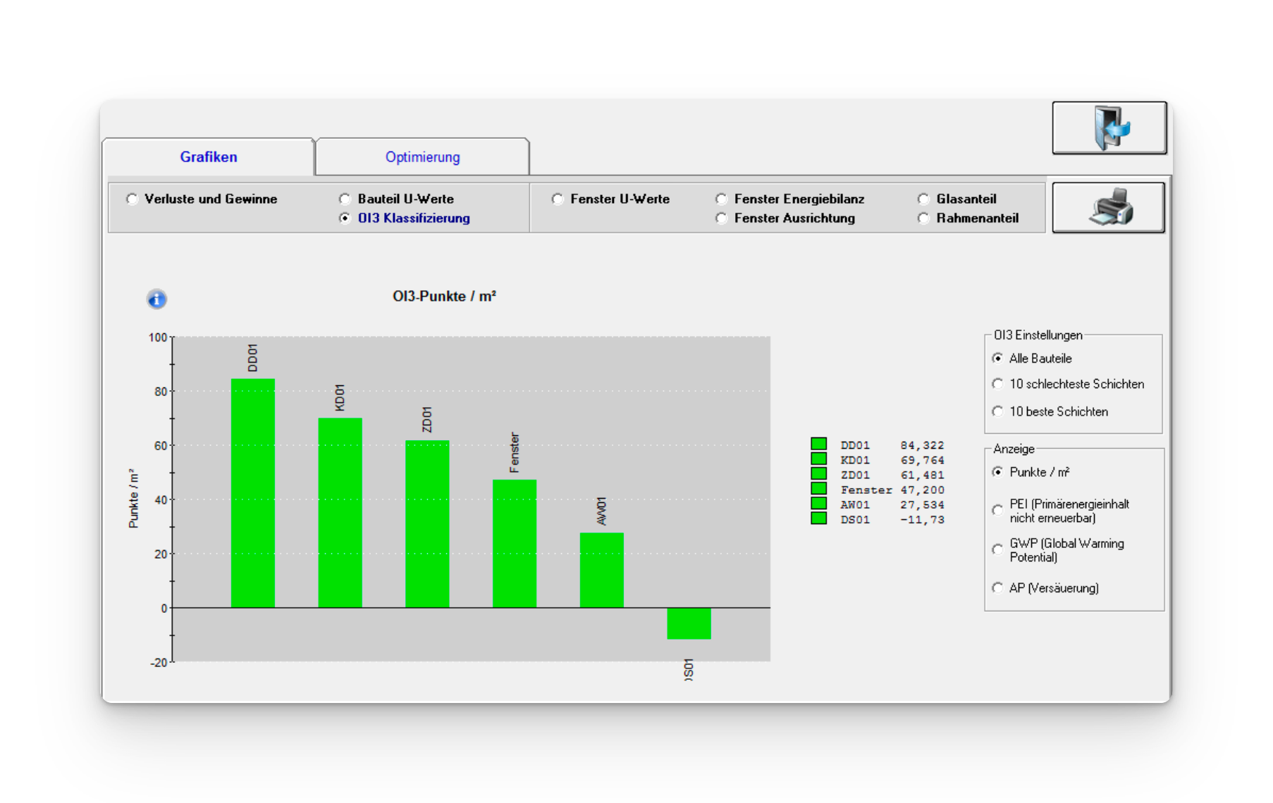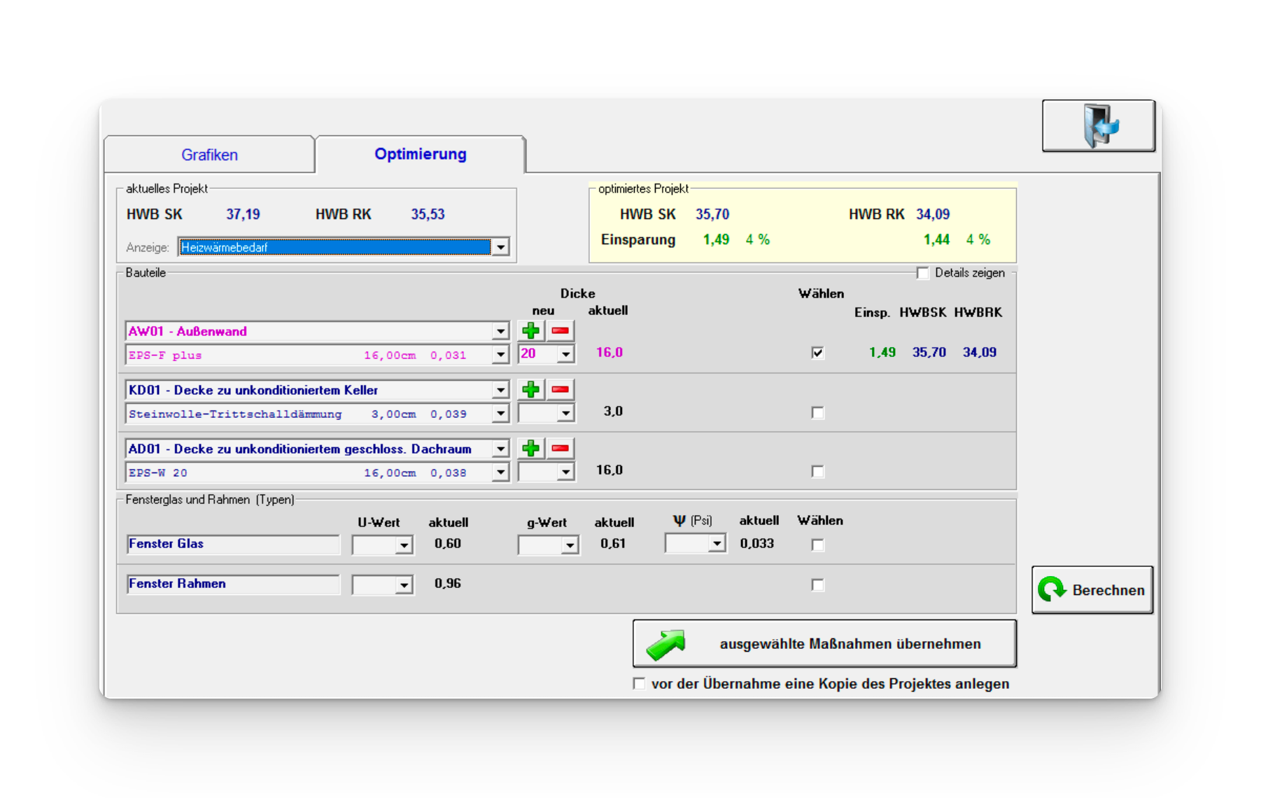 Berechnung von Optimierungsvarianten z.B. Wie verändert sich der HWB, wenn bei der Fassade zusätzlich 2cm Wärmedämmung angebracht werden.