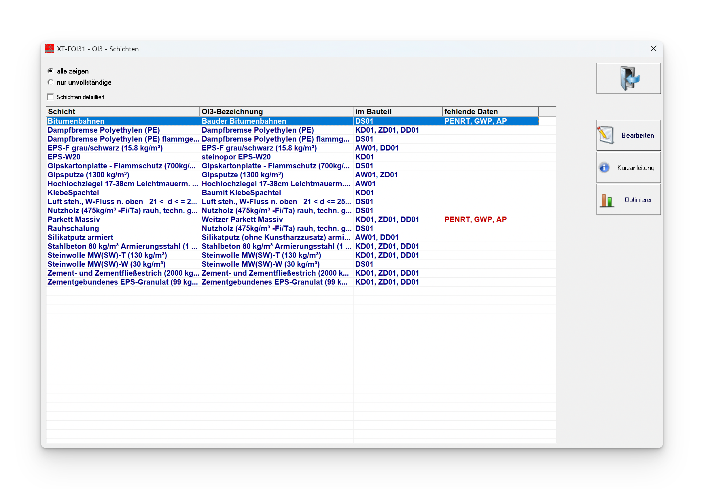 Unvollständige Bauteilschichten werden aufgelistet und können nachträglich zugeordnet werden.