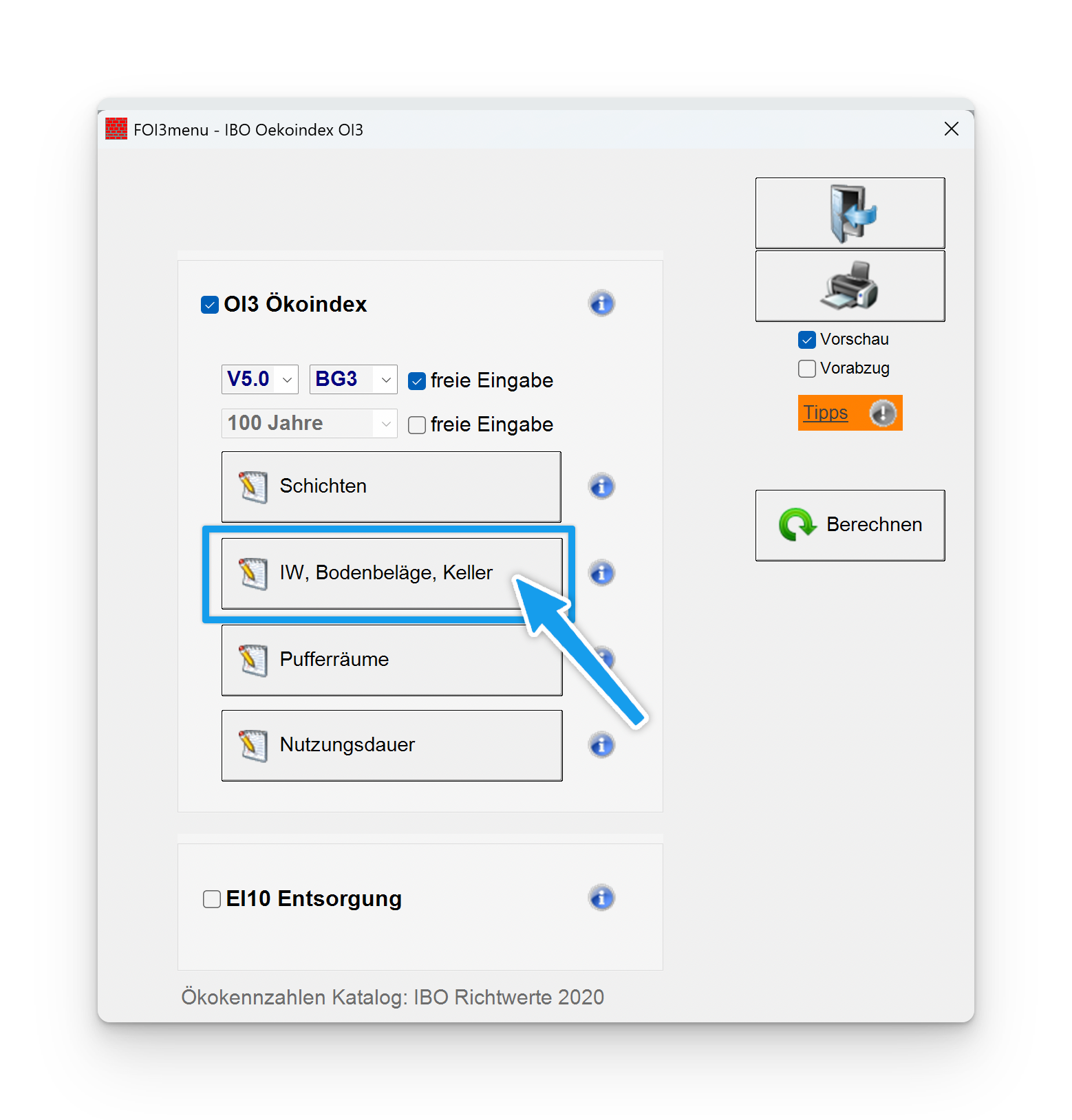Vereinfachte Berechnung für Innenwände, Bodenbeläge, Keller, Tiefgarage uns. gemäß Leitfaden "HEROES".