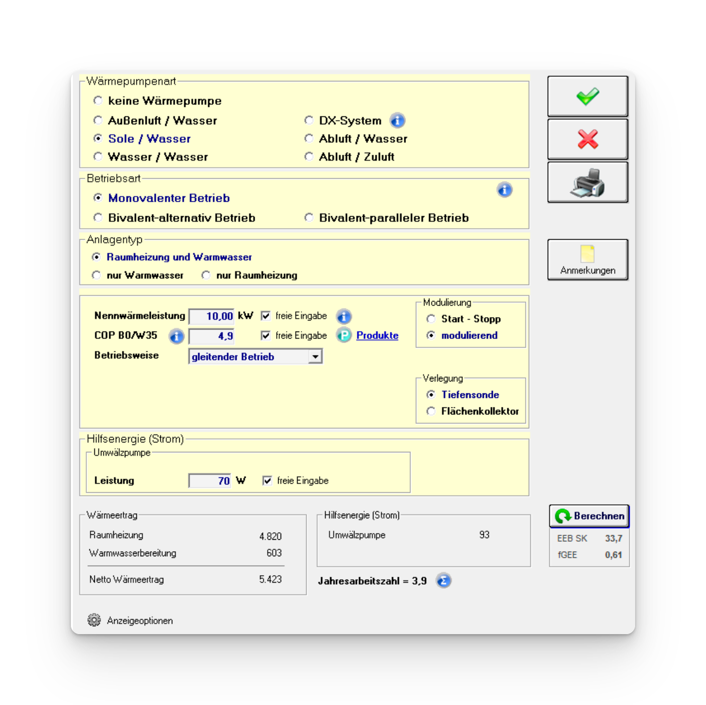 Nennleistung, Vorlauftemperatur, Betriebsweise, Baujahr, Modulierung, (nur bei Sole/Wasser: Verlegung) |