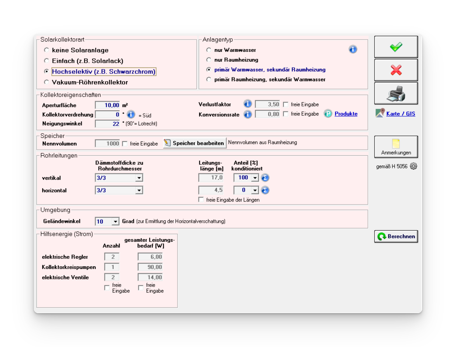 Für Regelwirkungsgrad, Konversionsrate und Verlustfaktor werden durch die Auswahl der Kollektorart Werte hinterlegt. Die Vorschlagswerte können bei Bedarf überschrieben werden. |
