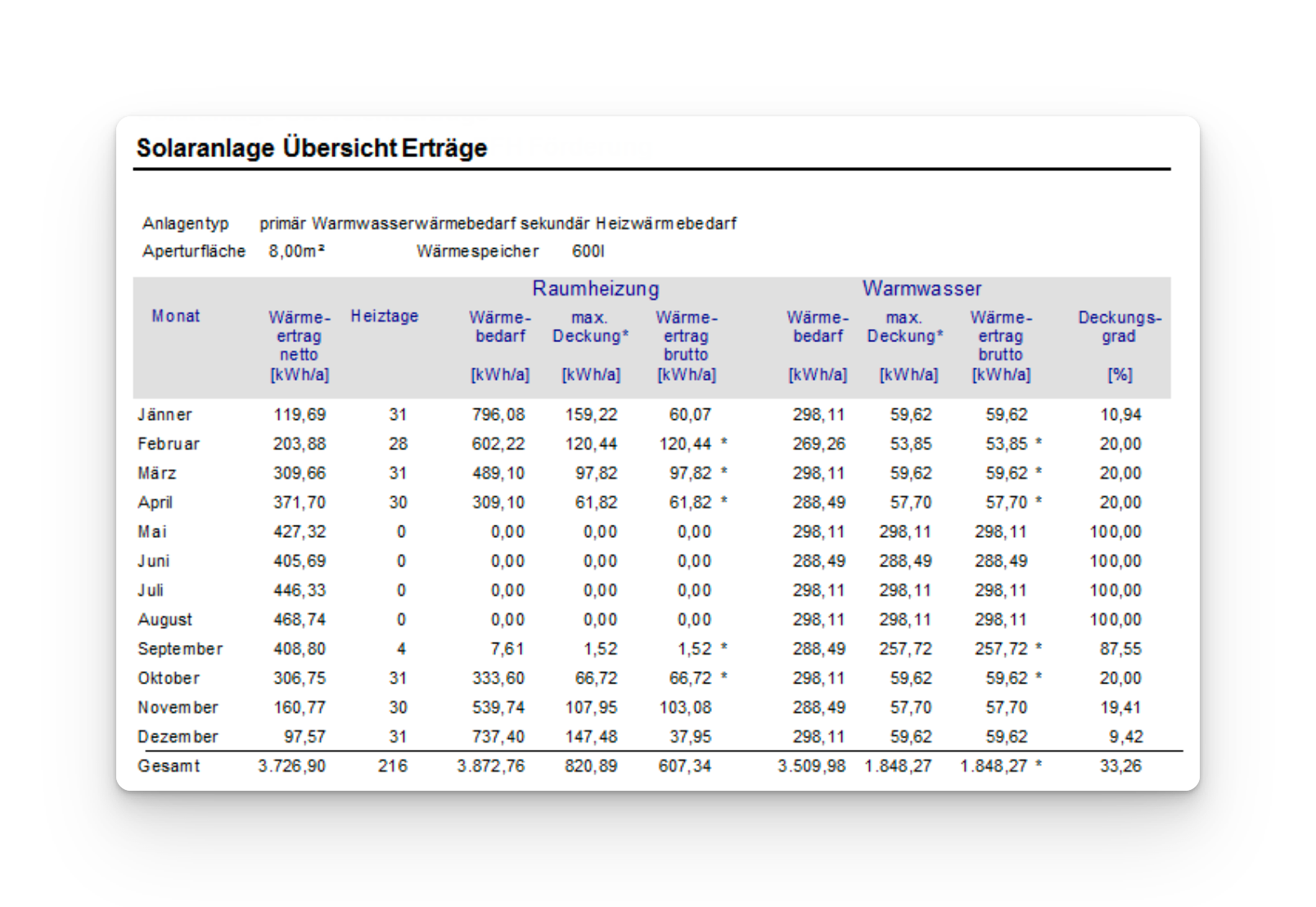 Mit einem Klick auf den Infobutton kann eine detaillierte Auswertung der Wärmegewinne der Solaranlage erfolgen. Diese wird dann in Form eines Ausdruckes erstellt.