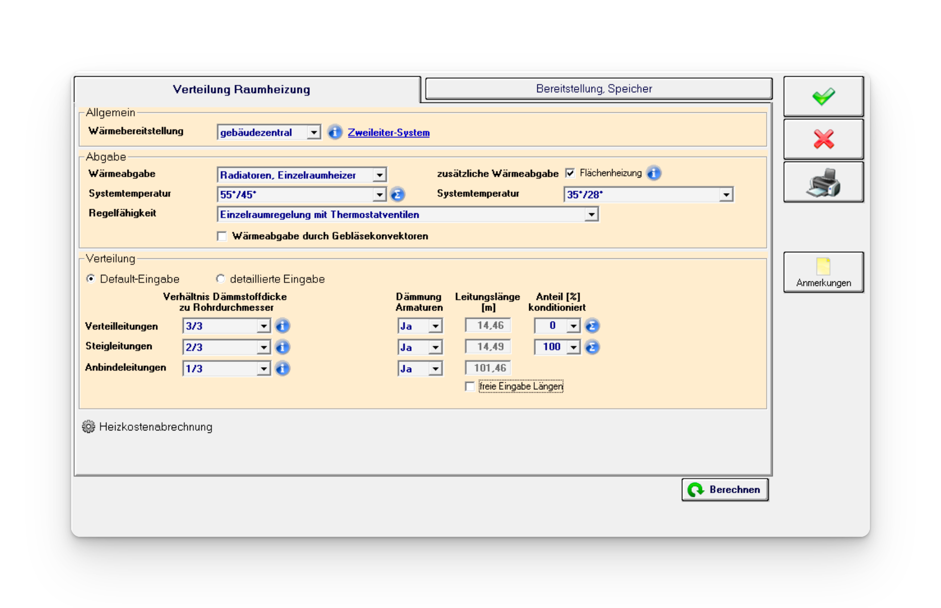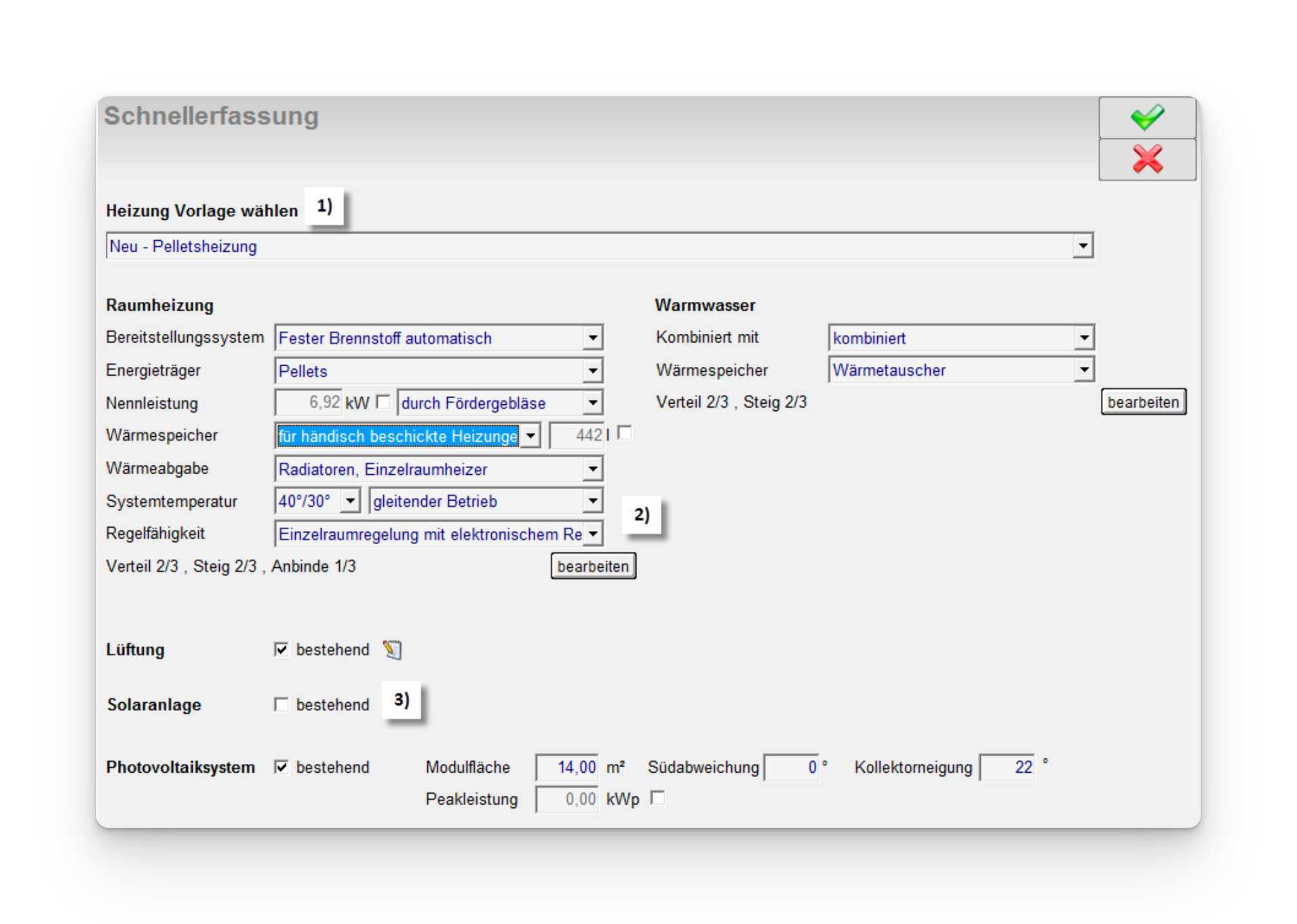 Die Schnellerfassung erlaubt die unkomplizierte Eingabe eines Referenzsystems als Grundlage für die Heizenergiebedarfsberechnung.