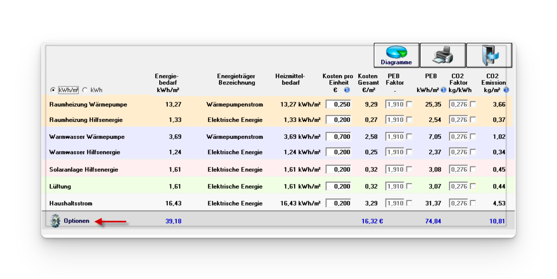 Darstellung der Ergebnisse der Bedarfsberechnung. Durch Eingabe der Kosten pro kWh können Betriebskosten abgeschätzt werden.