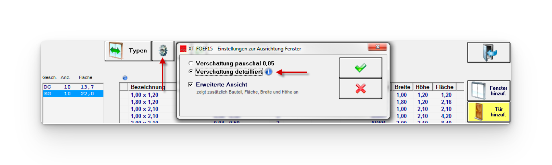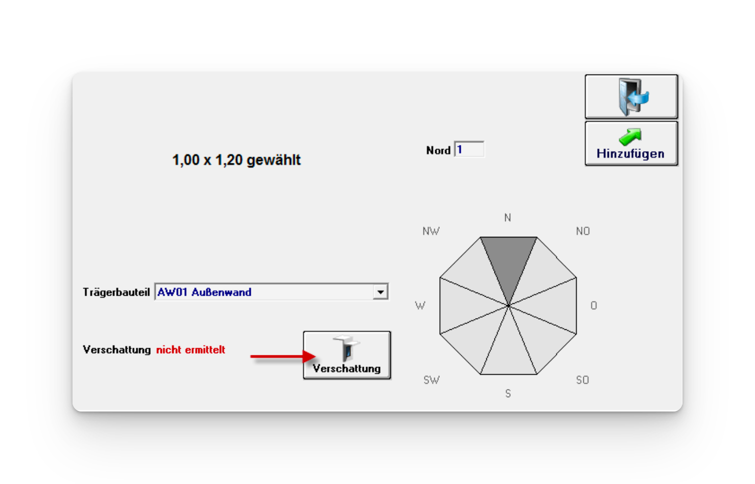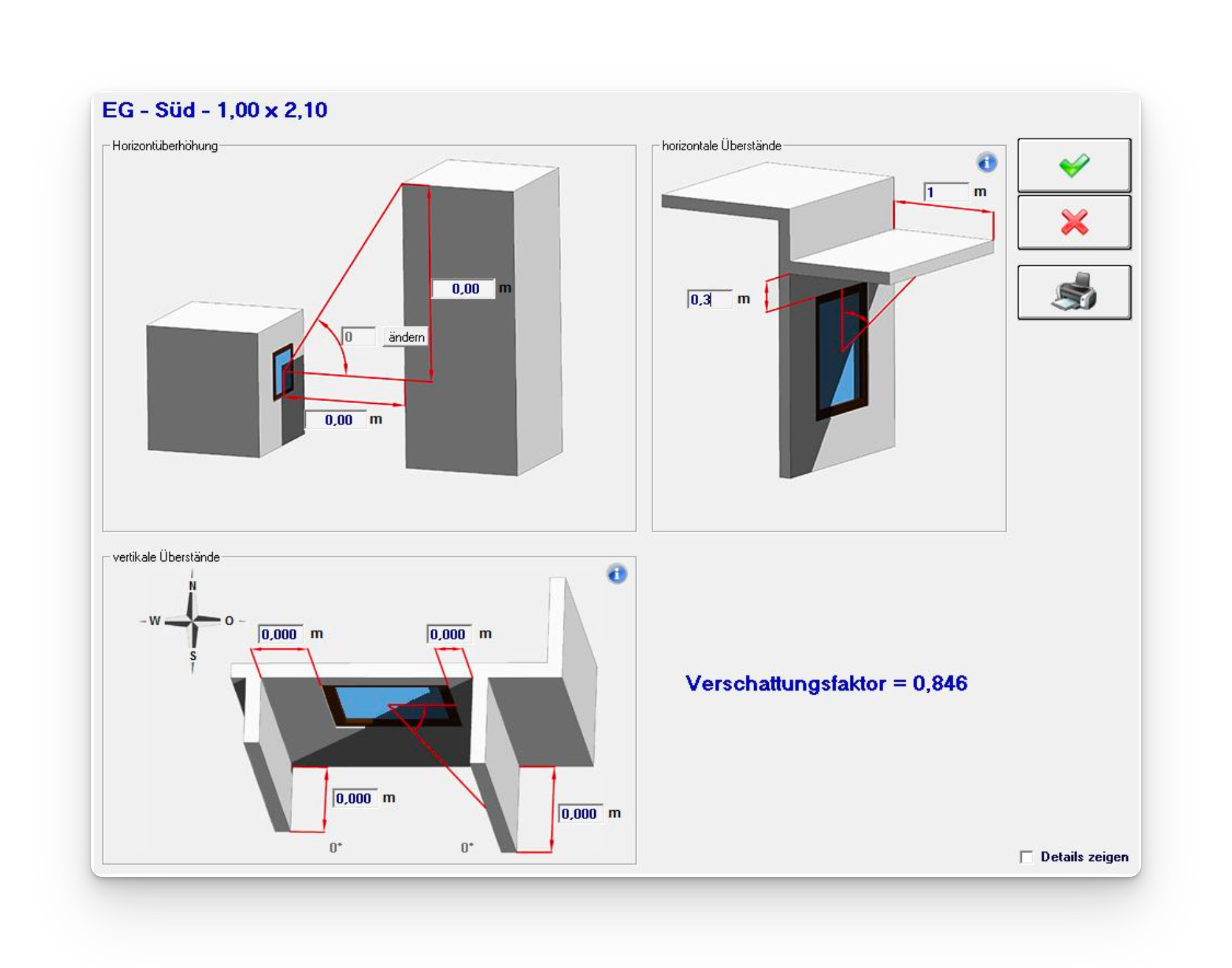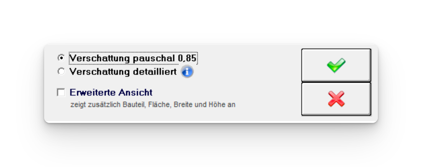 Detaillierter Verschattungsfaktor des Fensters, kann mittels Button Verschattung eingegeben werden.