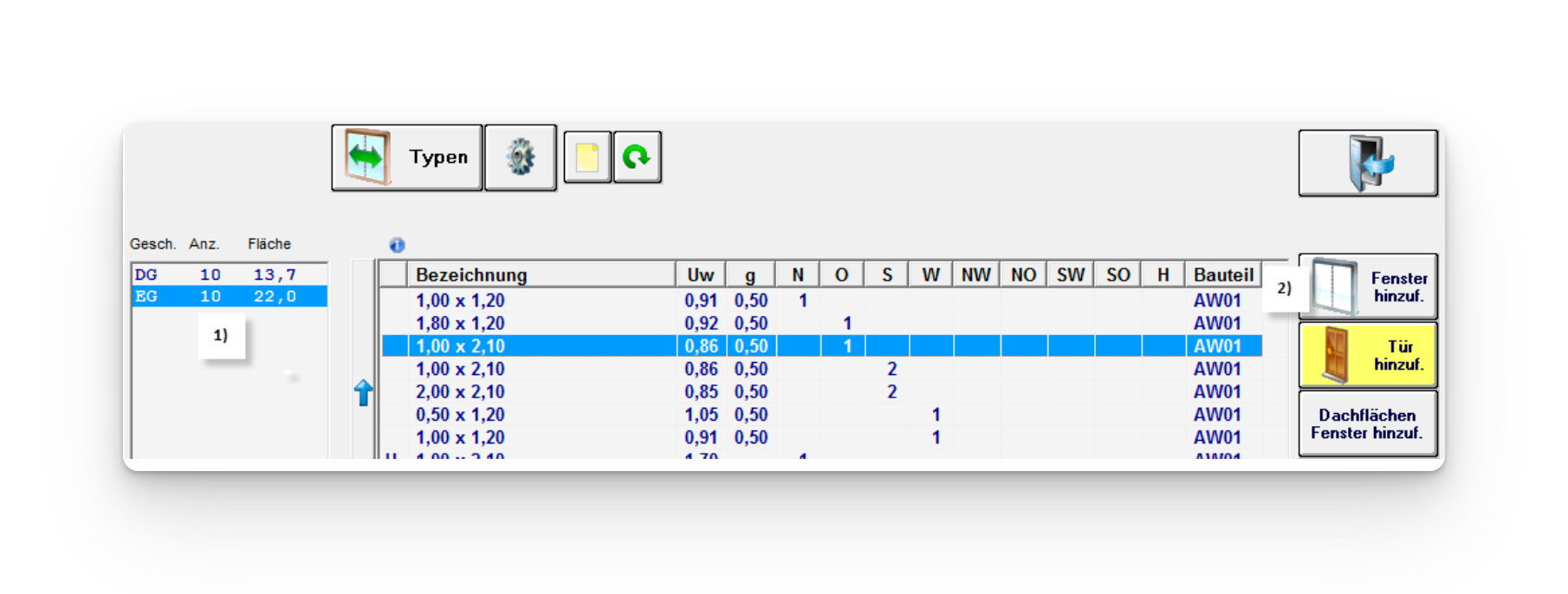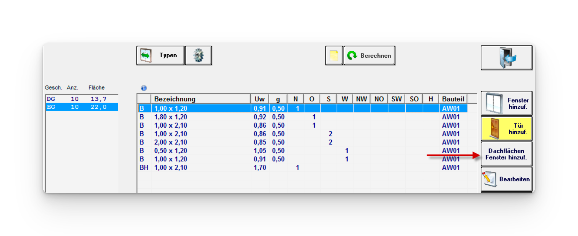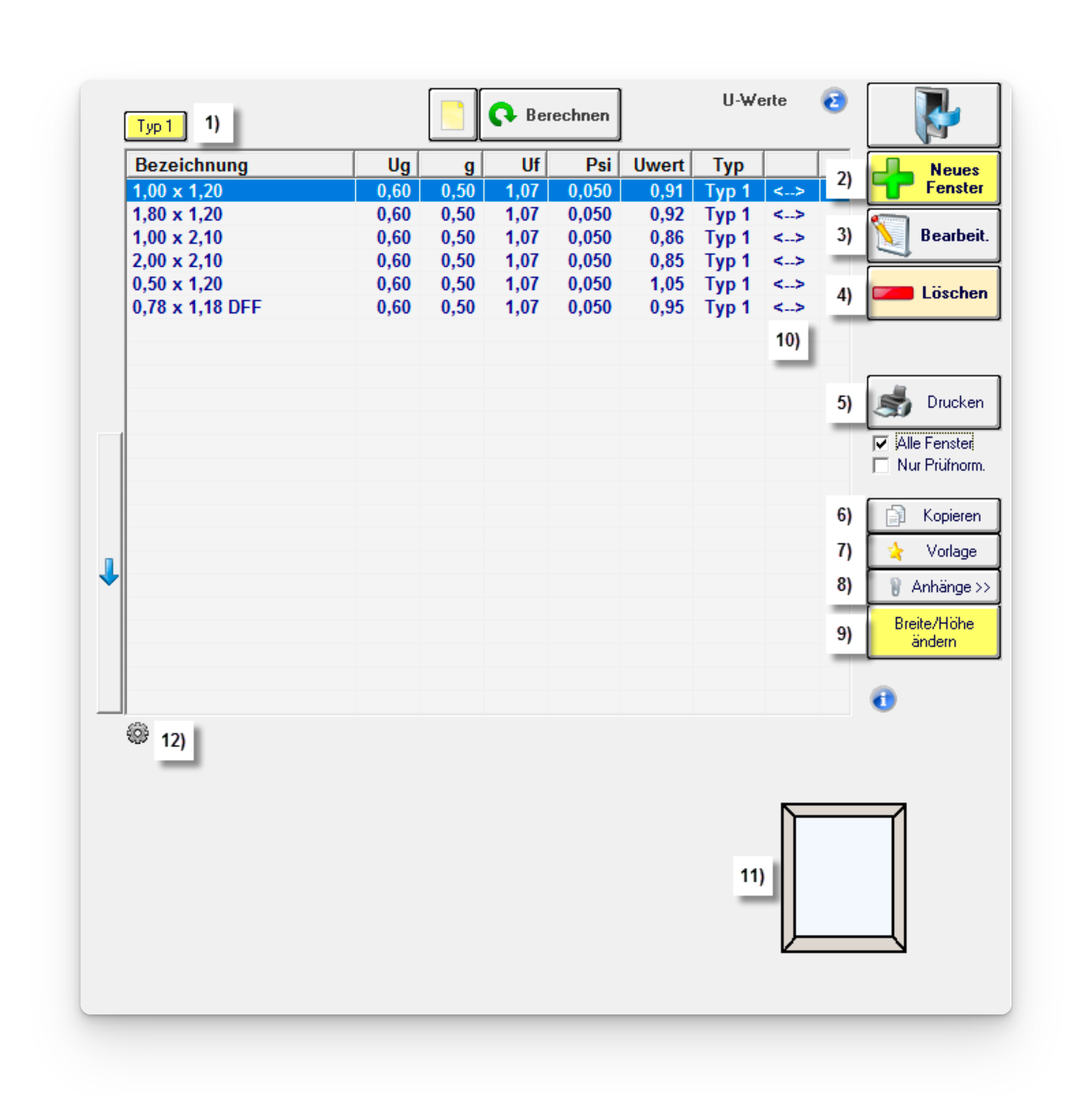 Enthält alle Fenstergrößen die im Menüpunkt „Typen“ angelegt wurden. Darüber hinaus besteht die Möglichkeit der freien Eingabe (Abmessungen, U-Wert).