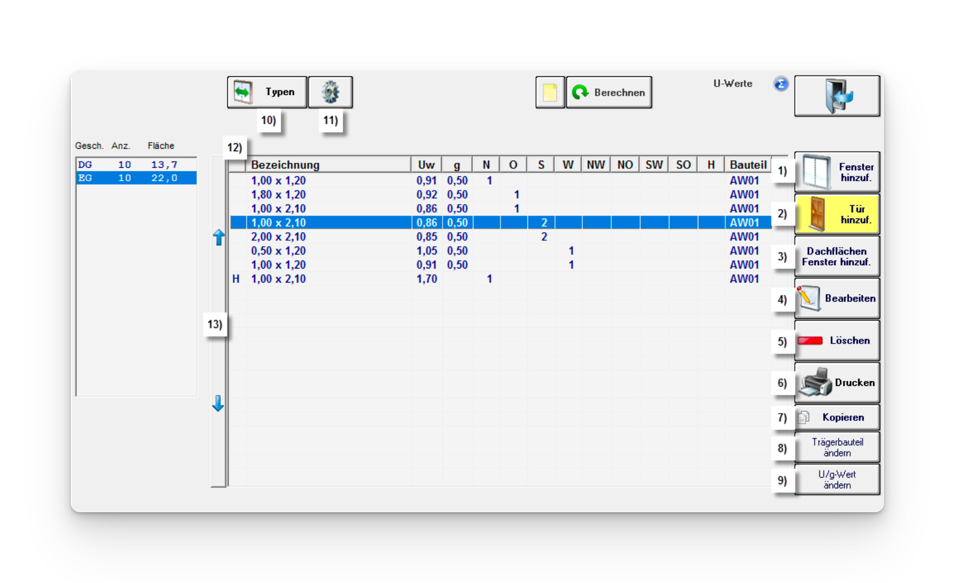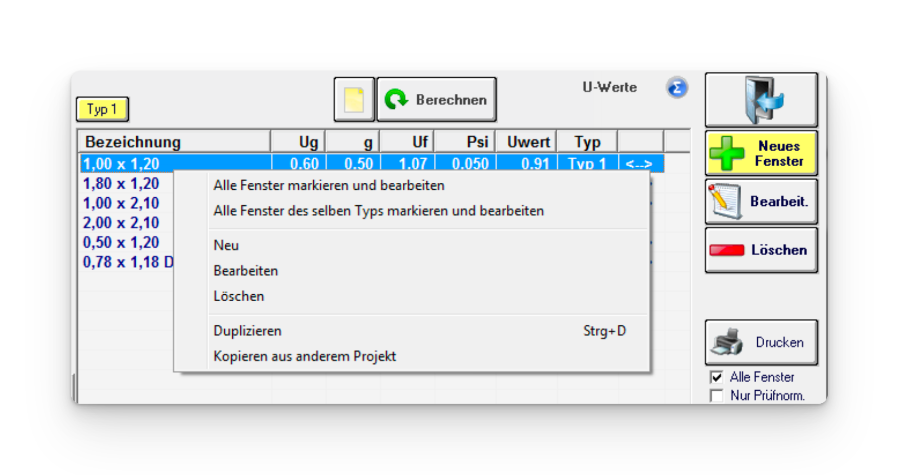 Eingabe von Fenstern und Fenstertüren detailliert. Berechnung des U-Wertes gem. ÖNORM EN ISO 10077. Übersicht der im Projekt enthaltenen Fenstergrößen.