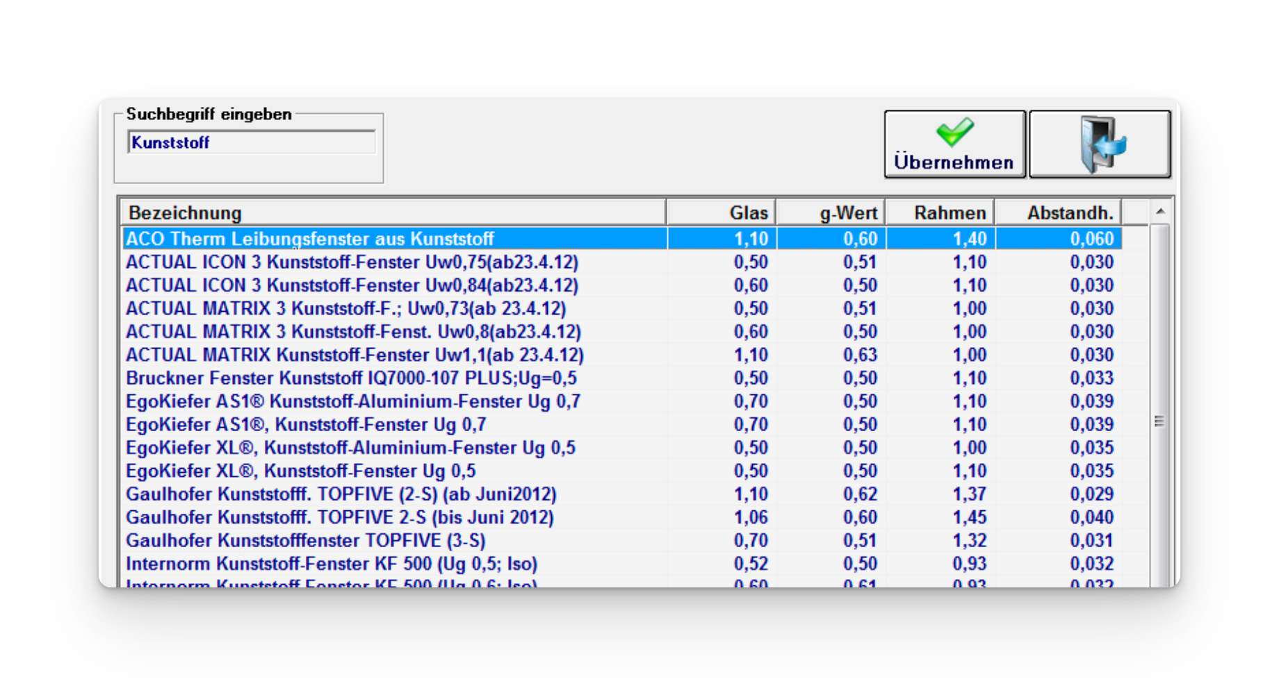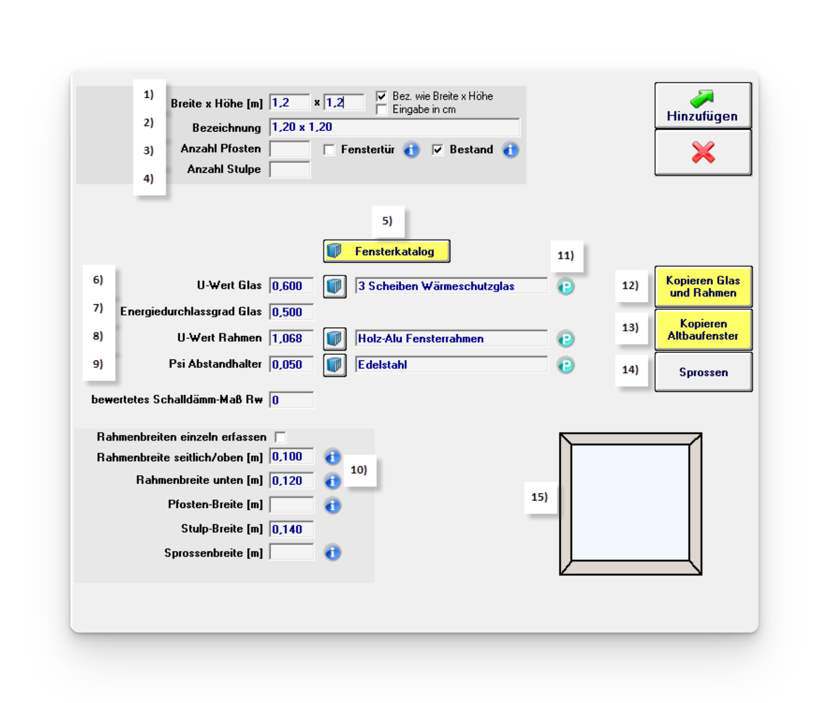 Übernehmen von Glas- und Rahmenwerten aus dem Altbaufensterkatalog.