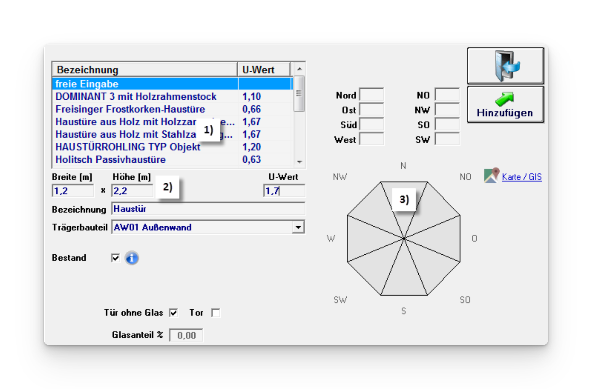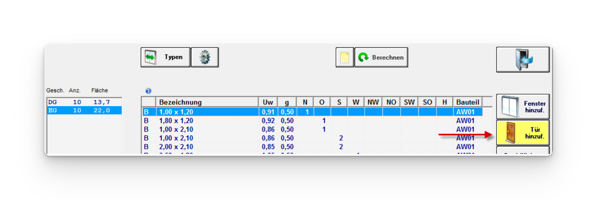 Unter Ausrichtung (7.1) mit Klick auf „Tür hinzufügen“ um eine Haustür oder z.B. eine Innentür zu Garage zu erfassen (für verglaste Terrassentüren wird der Button „Fenster hinzufügen“ verwendet).