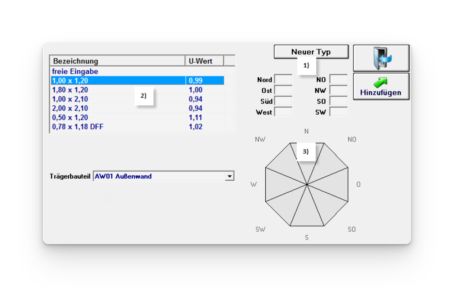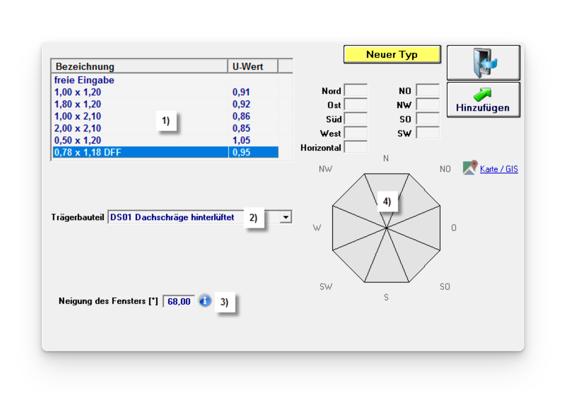 Der Menüpunkt Typen dient zur Erfassung der einzelnen Fenster-Grundtypen welche im Projekt enthalten sind. Erfasste Fenster-Typen können unter „Ausrichtung“ einem Trägerbauteil und einer Himmelsrichtung zugewiesen werden.